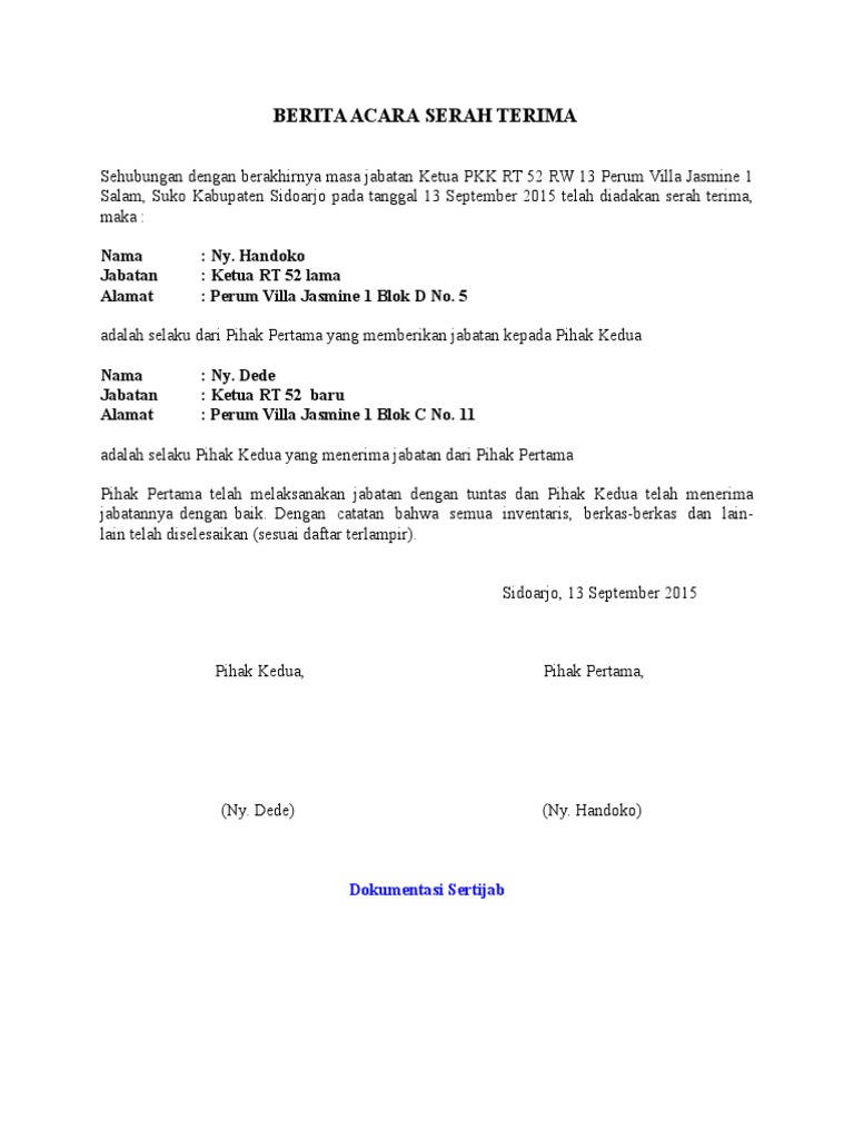 Contoh Surat Berita Acara Serah Terima Jabatan Rt from image.slidesharecdn.com Berita acara pemilihan ketua rukun tetangga 29 kelurahan pakuncen, kecamatan wirobrajan masa bakti 2018 s/d 2021 pada hari ini minggu tanggal 25 bulan februari tahun 2018 bertempat di rumah bapak arif budi utomo, telah diadakan. Surat kuasa jika pengurusan diwakilkan dengan materai rp6.000. Secara umum berita acara memiliki susunan yang sama setiap jenisnya, baik itu berita acara kehilangan 5. Contoh surat undangan resmi rapat ketua rt hut ri. Maka beda halnya dengan surat keterangan belum menikah ini yang mengharuskan pihak lain, dalam hal ini ketua rt untuk tingkat rt/rw, kepala desa untuk di desa maupun lurah untuk di kelurahan. Penyampaian berita acara berita acara pemungutan suara dan penghitungan suara di tps dibuat 3 (tiga) rangkap: Doc berita acara pemilihan ketua rt fardhan zabid. Berita acara pemungutan dan penghitungan suara pemilihan ketua rw.